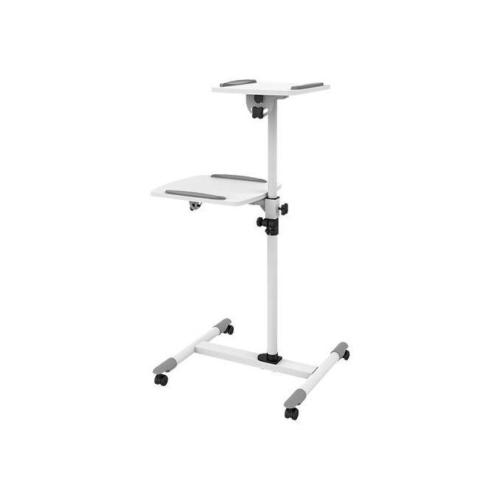 - Supporto proiettore o laptop per presentazioni, fino a 10 kg\n- Altezza regolabile da 850-1100 mm\n- Vassoio 300x350mm, permette di supportare oltre al laptop anche un mouse, un caricatore o altro\n- Le due piattaforme di supporto possono ruotare di 360mm e hanno un movimento verticale di 35° per ottimizzare l'angolo di visione\n- I supporti rialzati impediscono al dispositivo di cadere\n- Con ruote per agevolare il movimento\n- Per centri conferenze, hotel, presentazioni, classi, sale dimostrazione